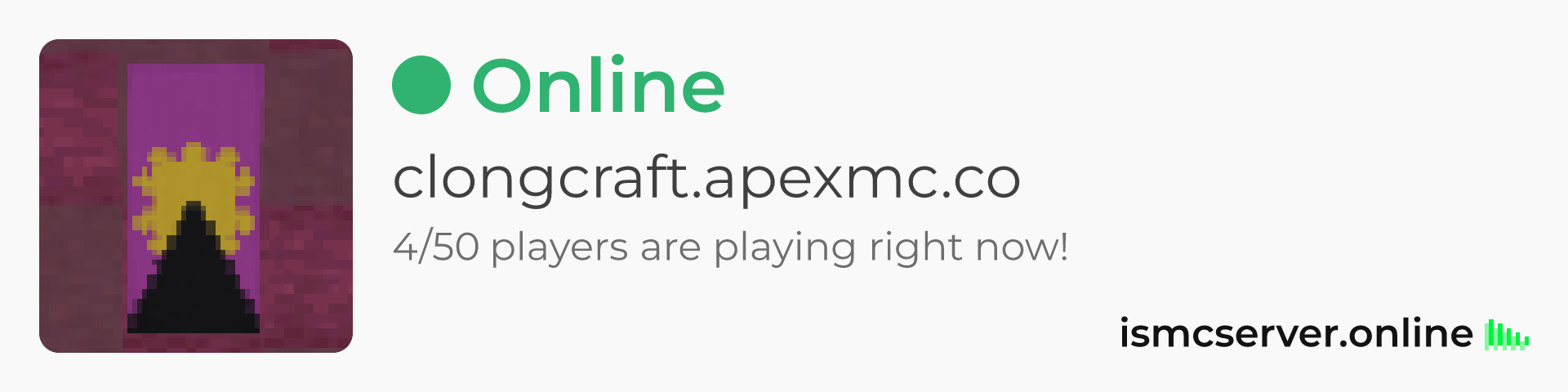 Dark theme: https://ismcserver.online/clongcraft.apexmc.co/widget?dark=true