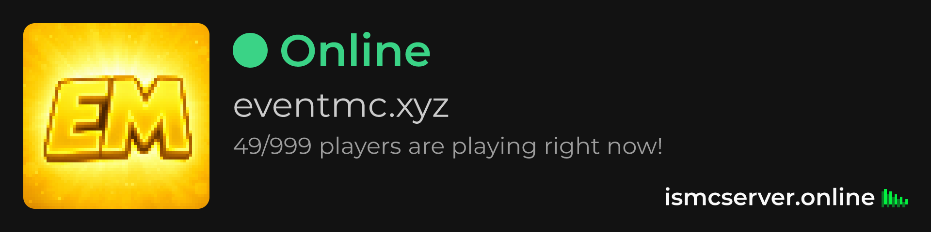 Dark Rounded image: https://ismcserver.online/eventmc.xyz/widget?dark&rounded