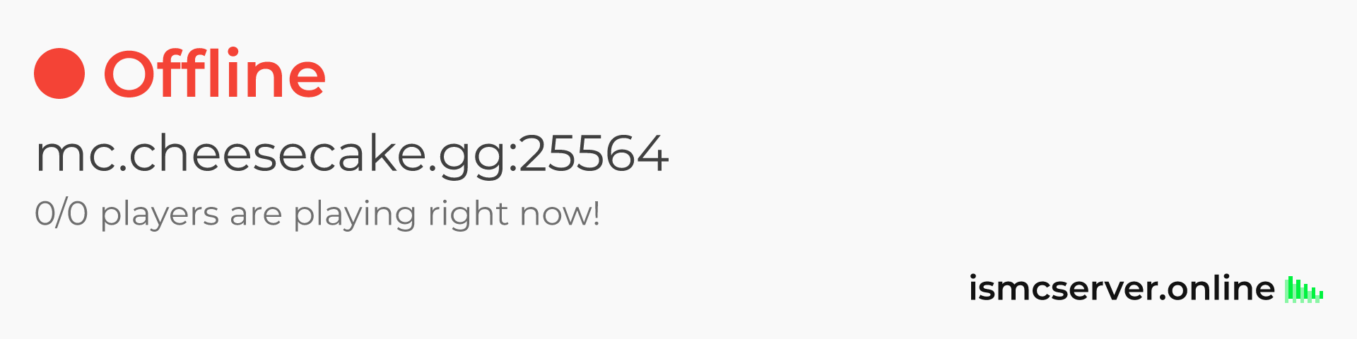 Dark theme: https://ismcserver.online/mc.cheesecake.gg:25564/widget?dark=true