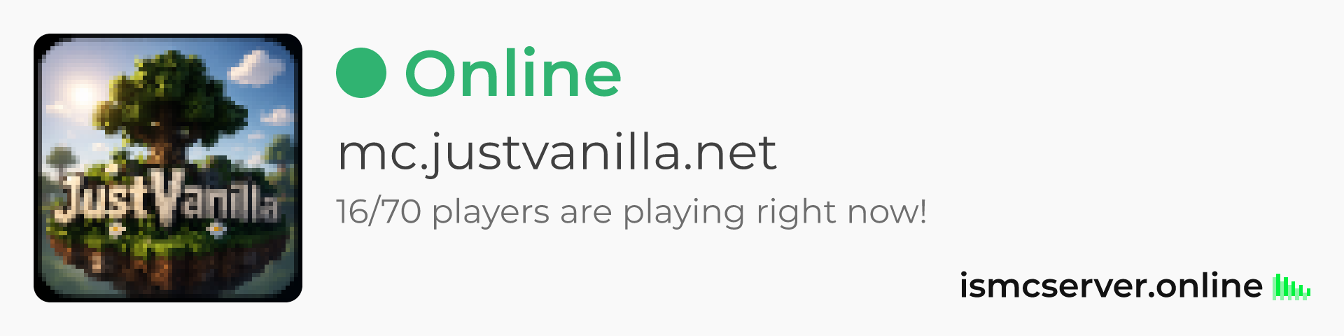 Dark Rounded image: https://ismcserver.online/mc.justvanilla.net/widget?dark&rounded