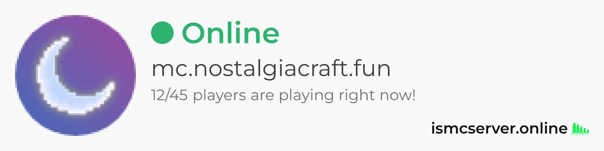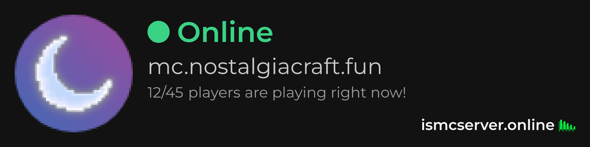 Dark Rounded image: https://ismcserver.online/mc.nostalgiacraft.fun/widget?dark&rounded
