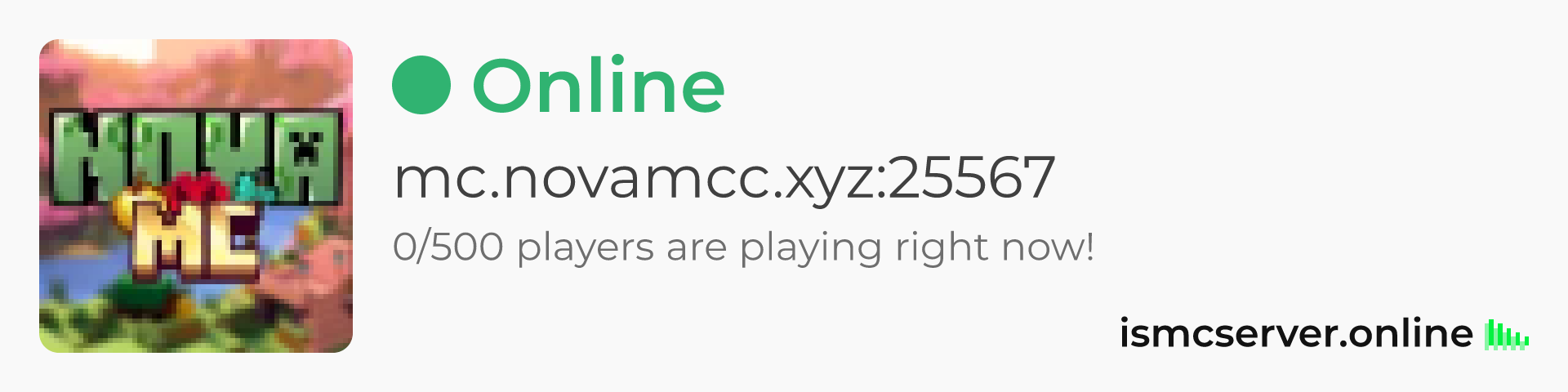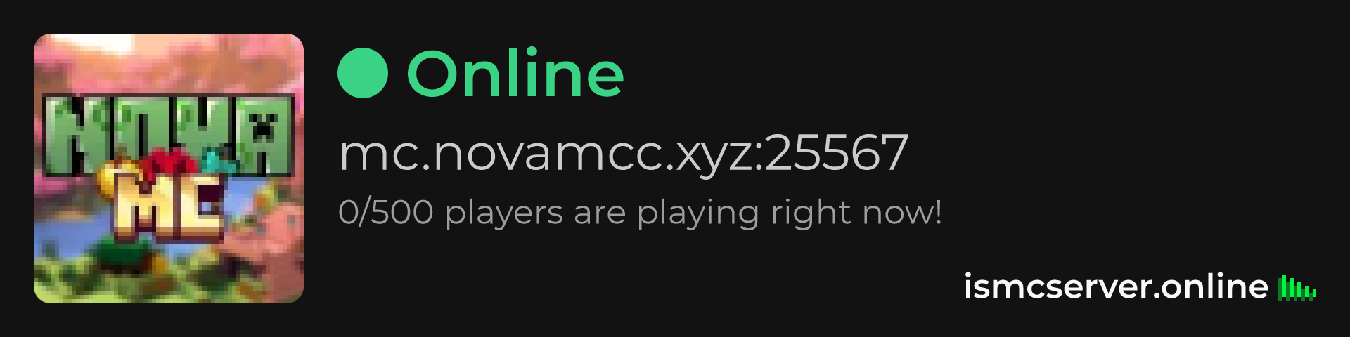 Dark theme: https://ismcserver.online/mc.novamcc.xyz:25567/widget?dark=true