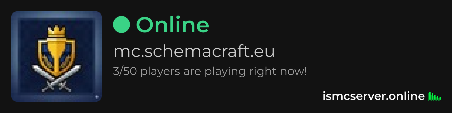 Dark Rounded image: https://ismcserver.online/mc.schemacraft.eu/widget?dark&rounded