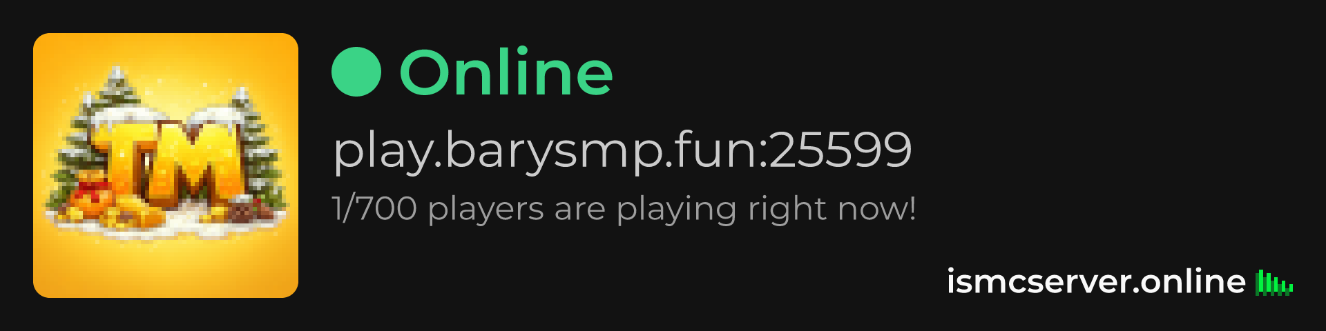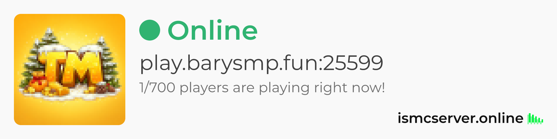 Dark theme: https://ismcserver.online/play.barysmp.fun:25599/widget?dark=true