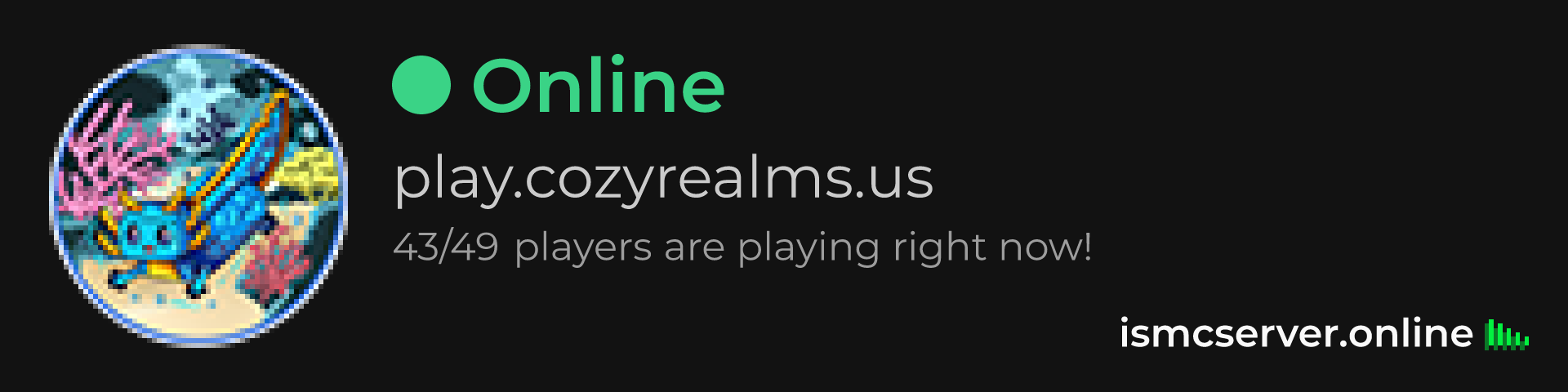 Dark Rounded image: https://ismcserver.online/play.cozyrealms.us/widget?dark&rounded