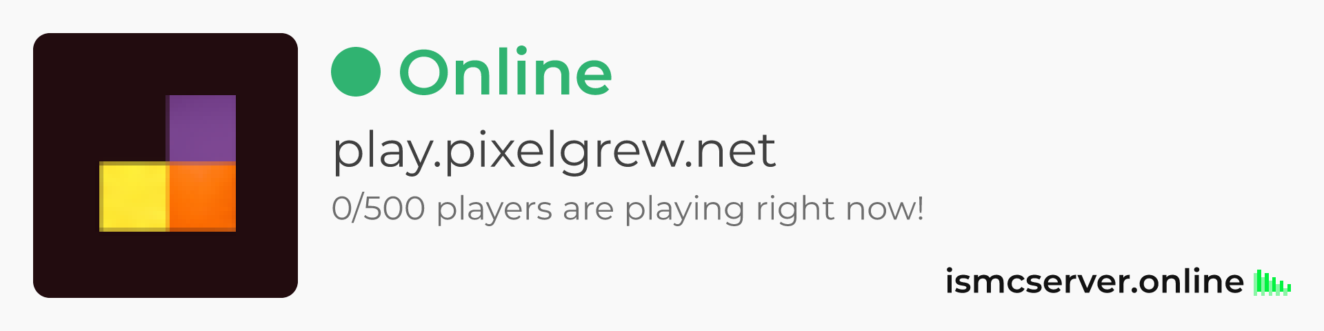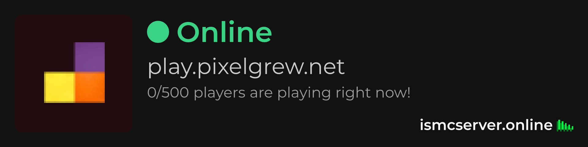 Dark Rounded image: https://ismcserver.online/play.pixelgrew.net/widget?dark&rounded