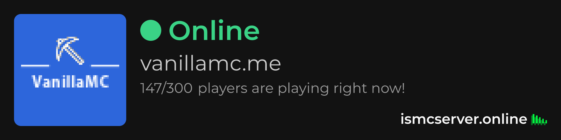 Dark Rounded image: https://ismcserver.online/vanillamc.me/widget?dark&rounded